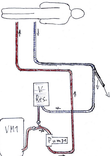 Klaus erläuterte anhand einer Skizze (V. Res. = venöses Reservoir, rot = arterielle Linie, blau = venöse Linie), von welcher Abzüge verteilt wurden, ein vereinfachtes Schema des geschlossenen Kreislaufs.